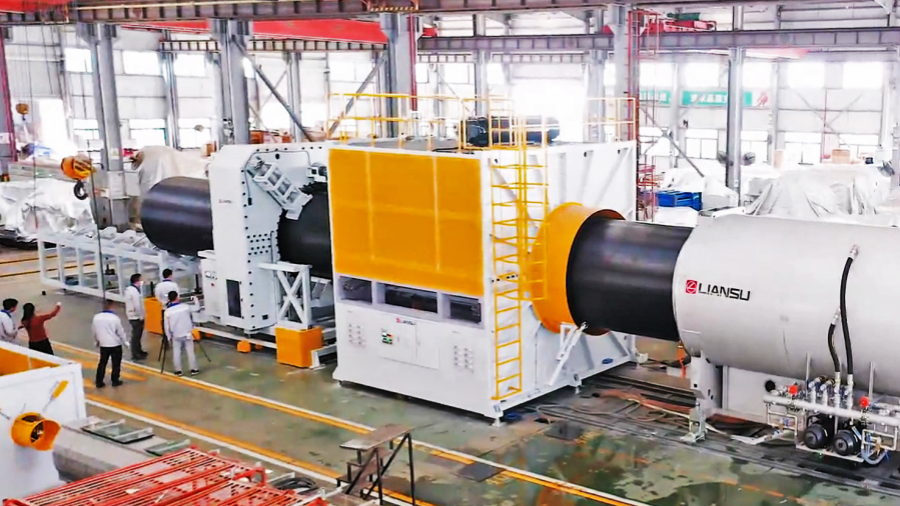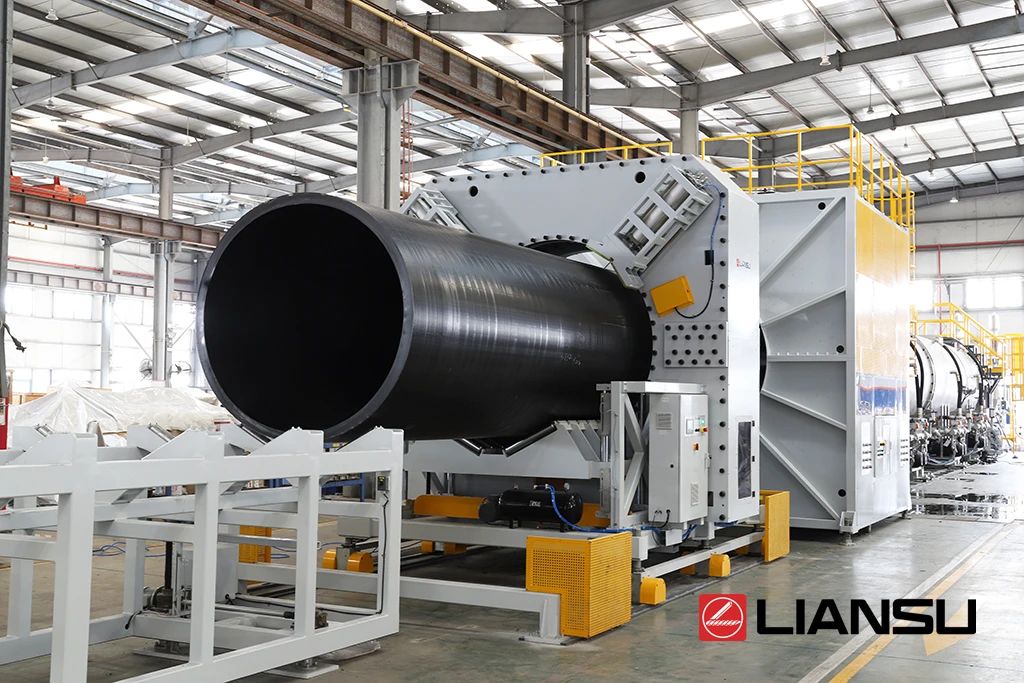眼前這條可擠出2米直徑HDPE實(shí)壁管的生產(chǎn)線,是聯(lián)塑機(jī)器的得意之作。目前鮮少塑機(jī)企業(yè)能夠?qū)崿F(xiàn)特大口徑HDPE管材生產(chǎn)裝備制造。