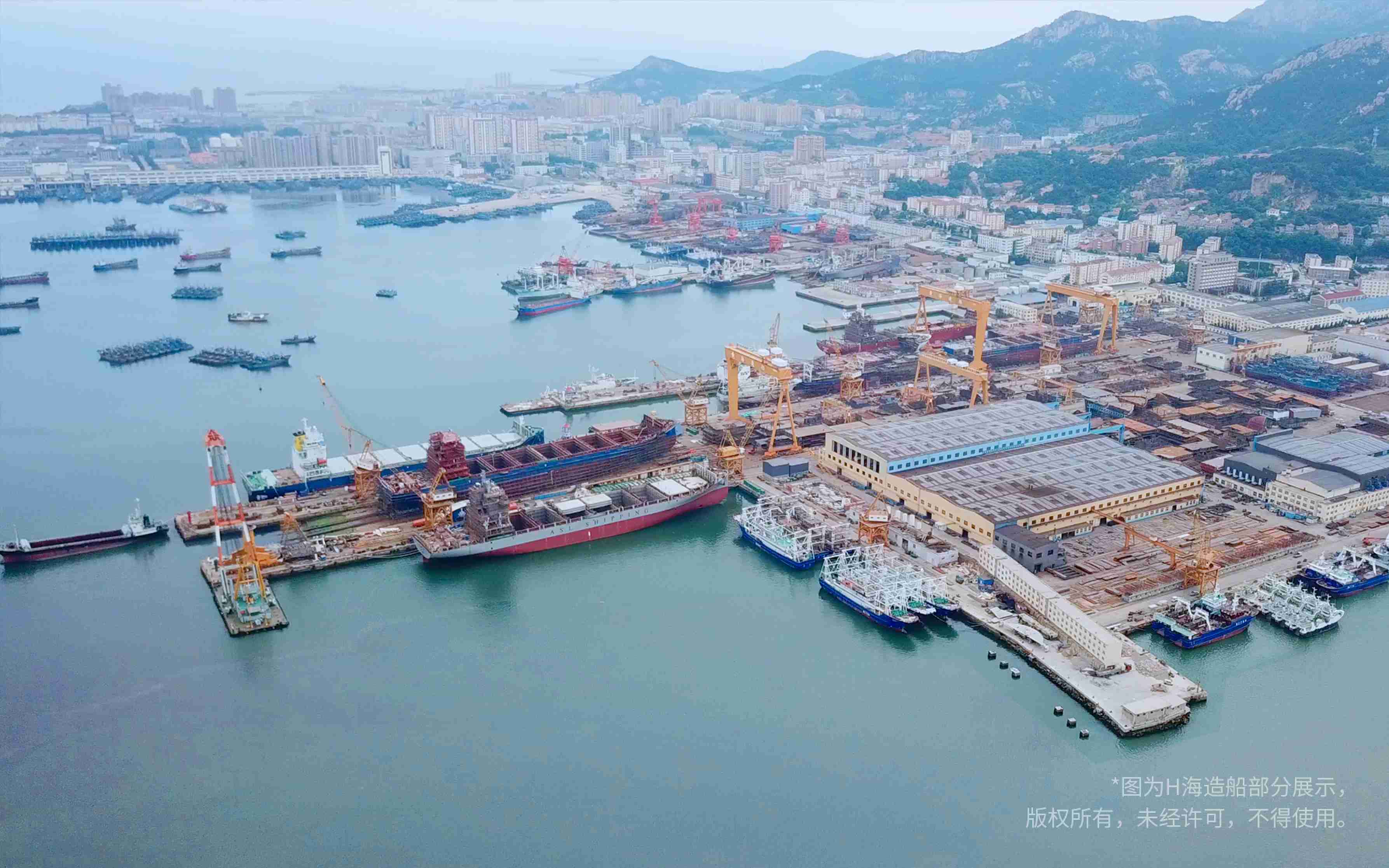 正值7月,流金鑠石,一艘艘正在建造的輪船沿海岸線排開,在H海造船有限公司的船塢和港池內(nèi)擺出了“巨人陣”。